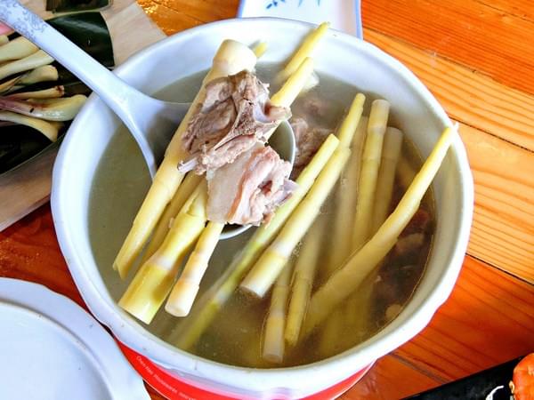 箭筍排骨湯 ,箭筍口感細嫩不粗糙 ,排骨肉軟嫩 ,湯頭喝起來相當清爽 。