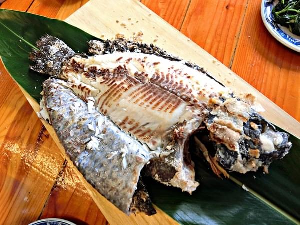 鹽烤台灣鯛魚,山泉水飼養,魚皮扒開來裏面魚肉雪白軟嫩,佐上椒鹽就相當夠味。