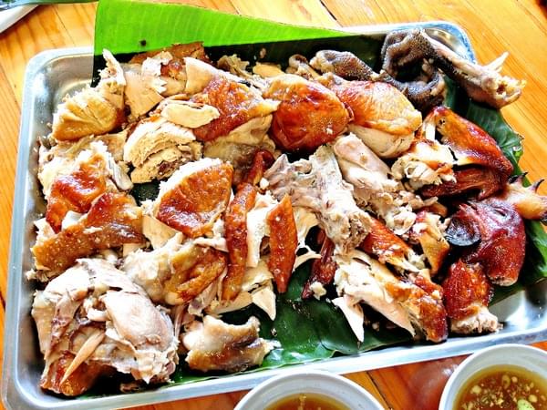 甕仔雞想吃什麼部位任君挑選 ,雞肉吃起來不乾柴 ,淋上醬汁風味更佳 。
