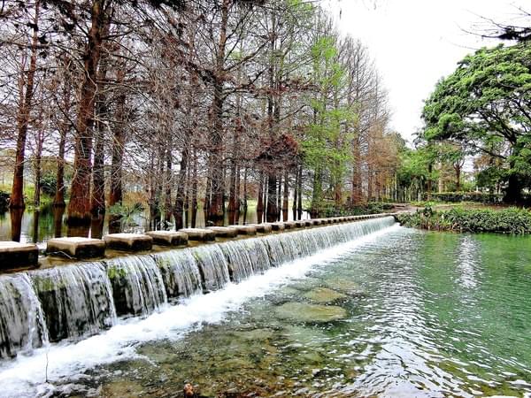落羽松旁的石階,配上潺潺流水,宛如一幅美麗的畫,美得不像話~