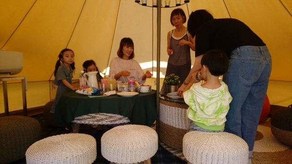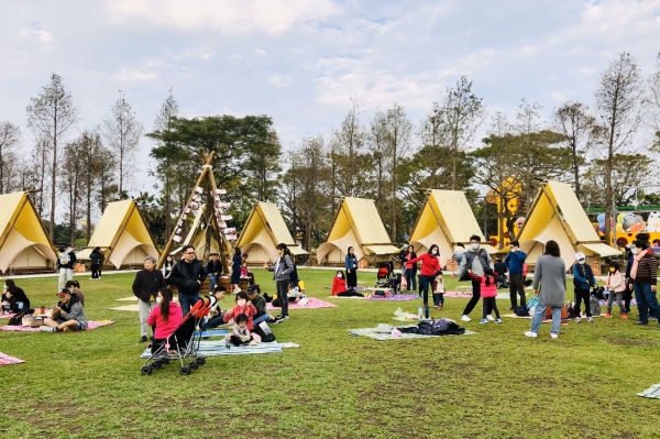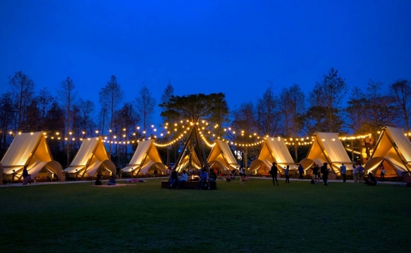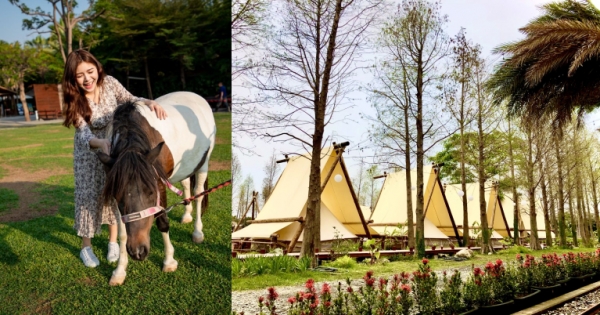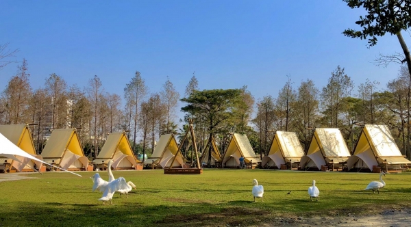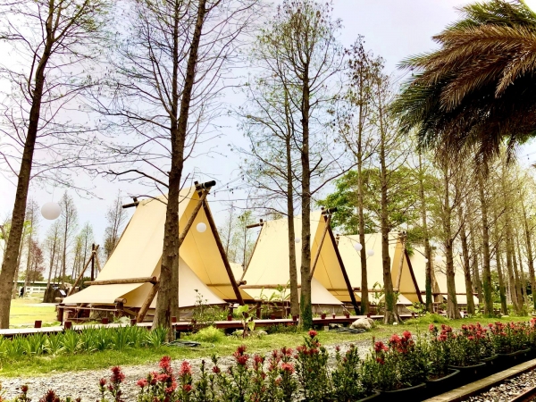 這裡有群聚的雅緻白色帳蓬,周圍有落羽松環繞,還可以在草地上悠閒野餐