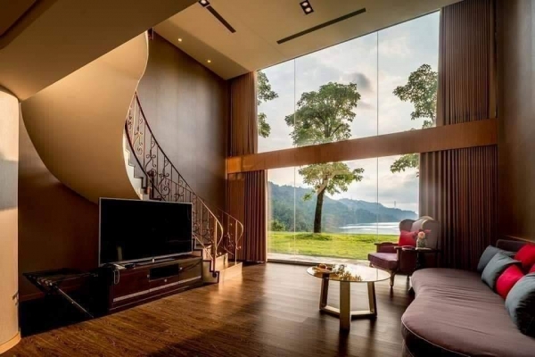 有著第一排湖景的超療癒渡假民宿,整體空間採挑高式的明亮設計,樓中樓的房內還有六米高的大片落地窗,躺在床上就能眺望全視角的無敵美景,而超大的客廳擺放一張貴妃椅,二樓還有規劃一池圓形浴缸,可以邊泡澡邊看湖景,可以盡情地發呆放空,超愜意又慵懶的渡假。