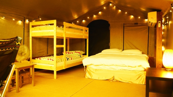 而親子狩獵帳也是讓人非常驚豔!超夢幻的房型設計,裡面有上下舖兒童床、冷氣及電風扇,床墊還特地選用IKEA套組,顛覆你對露營會睡不好作惡夢的印象,絕對讓你睡得舒適又安穩!