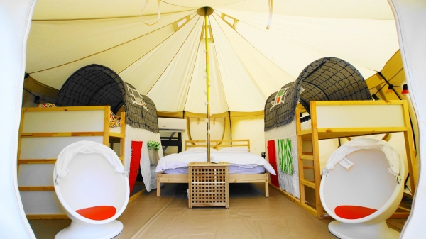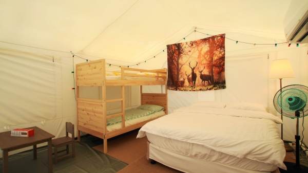 園區內提供了多種帳篷,像是蓮花帳、神殿帳、狩獵帳等等,超大舒適空間、設備超齊全,還貼心的附有冷氣及電風扇,讓你在炎炎夏日不用擔心露營太悶熱!
