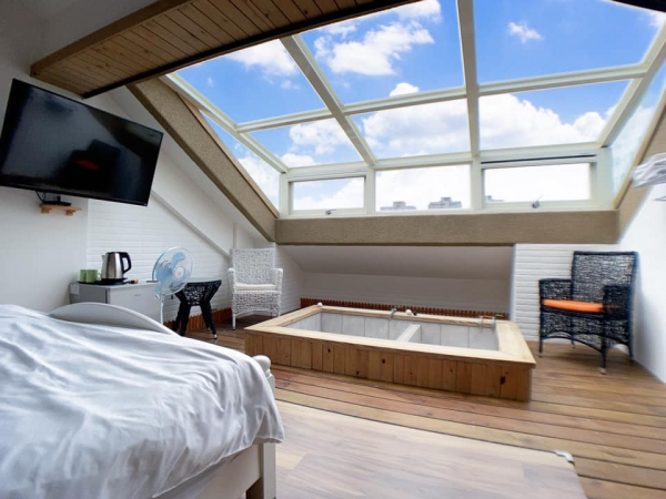 其中最吸睛的就是這間閣樓式房型啦!將近半個房間都是玻璃天窗,下方有個大大的木製浴缸可以泡澡,白天看藍天、夜晚賞星空,根本就是泡澡的極致享受!