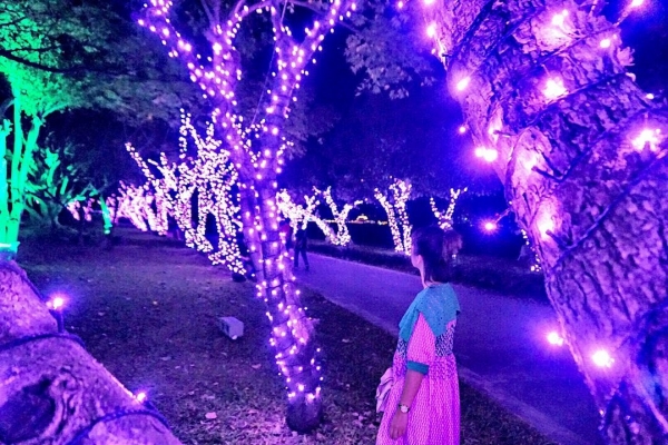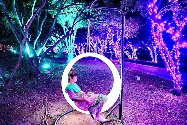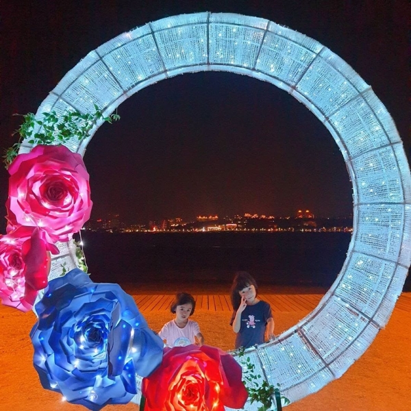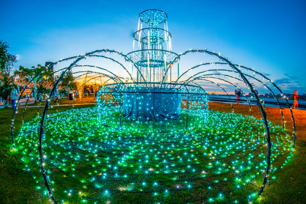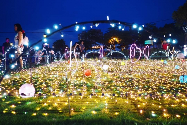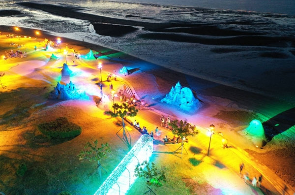 白天看似普通的沙灘,到了夜晚,打上七彩絢爛的燈光,多樣化的藝術造景,以及色彩繽紛的燈串,使得八里沙灘成為最夢幻的時空光廊!