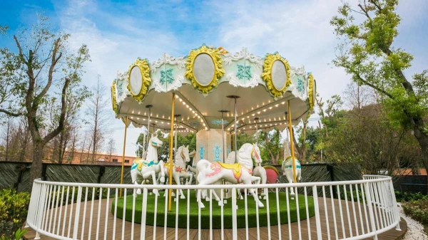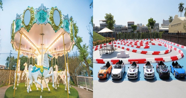 新悦花園酒店不但擁有千坪戶外綠地,也是全台唯一設有旋轉木馬的飯店,藍白配色有夠夢幻,每日定時開放免費乘坐,連媽媽都想來拍網美照。