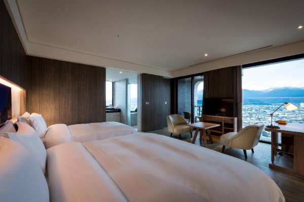 房內採現代簡約風格設計,讓夜間成為光芒璀璨的線型發光體,還有雙Y軸線設計,讓每間房都能欣賞大面窗景,是宜蘭度假的夢幻首選!