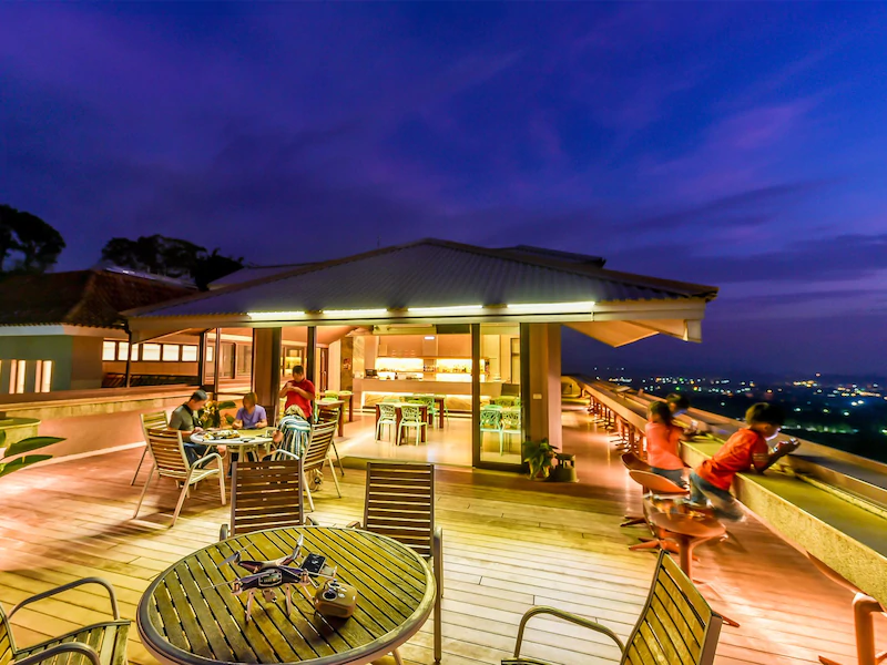座落於嘉義棕梠湖高爾夫球場旁,居高臨下80公頃綠地,館內規畫有各類房型,每間客房皆擁有寬敞獨立露天陽台,可俯瞰高爾夫球場,眺望仁義潭、嘉義市夜景、阿里山山脈,是雲嘉南地區擁有270度獨有的景觀視野渡假會館,除此之外館內還設有推杆練習場、空中觀景咖啡屋、西餐廳、SPA芳療、指壓按摩、健身房、購物精品店等休閒設施喔。