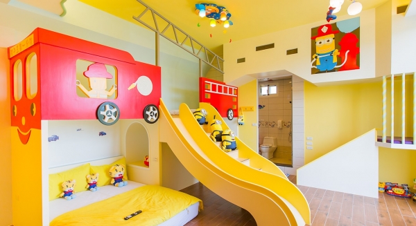 各式房型裡有不同的主題,更棒的是~每一間都有專屬的溜滑梯耶!小男生小女生都超愛的!
