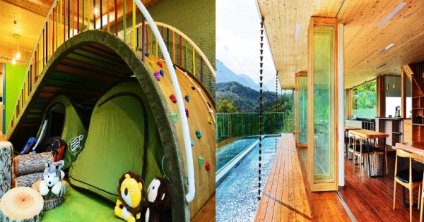 居然還有攀岩橋!!住在森林環繞的超大溜滑梯及帳篷下,享受野外露營的樂趣但又有室內完整的設備,應該是小朋友跟家長的最愛