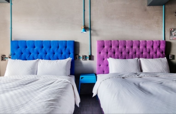 使用馬卡龍絨布色系的床頭跟沙發,搭配水泥色的牆面,木質調的家具擺設,感覺有畫龍點睛的效果,非常簡約時尚~~~~