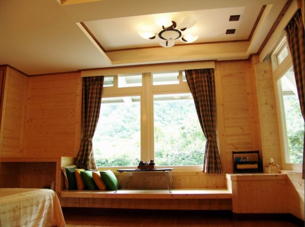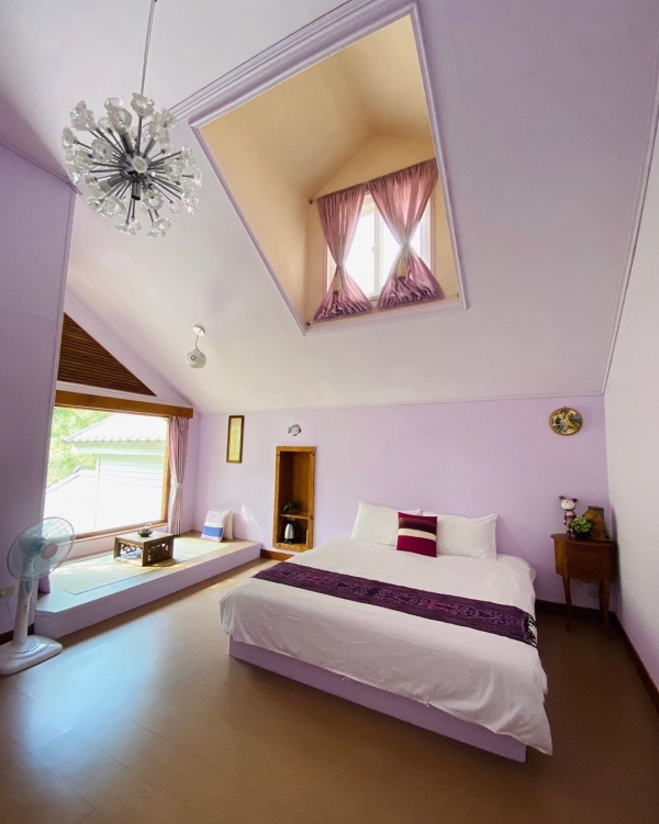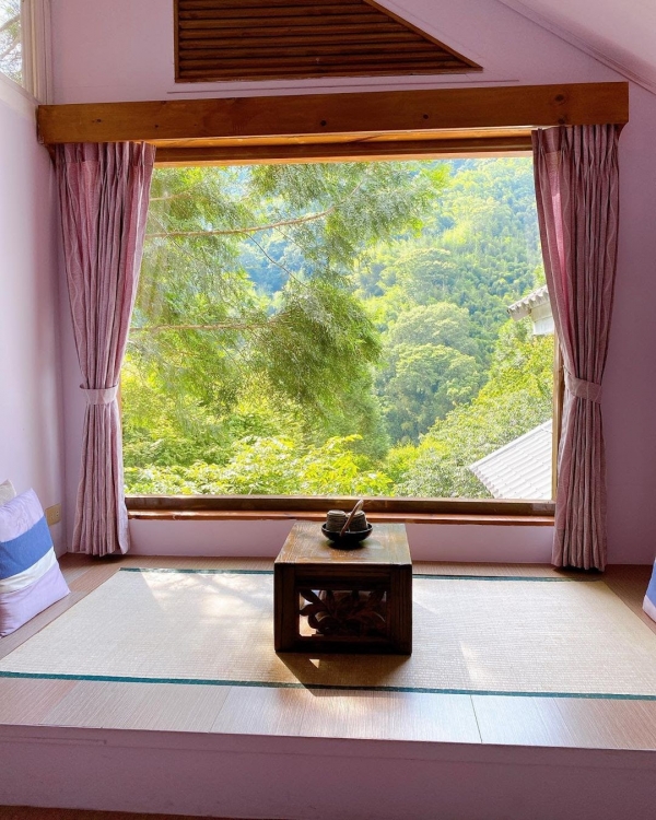 走進來就被這高挑的設計驚艷到,粉嫩色調為基底,超高挑的房間,還有小天窗,床邊還有小和式空間,超大片的窗景,搭配榻榻米以及茶几組,慵懶的賞著窗外美景,邊喝茶多麼愜意阿!