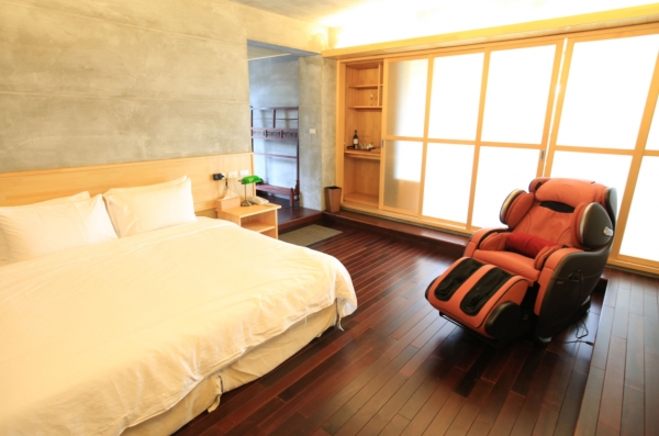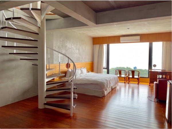 其中樓中樓景觀房最為吸睛!極簡寬敞的住宿空間,以清水模原色為主色調,僅以少許的暖色光線點綴,再以老古董家具搭配新派床組,讓室內呈現一股獨特的衝突美感!