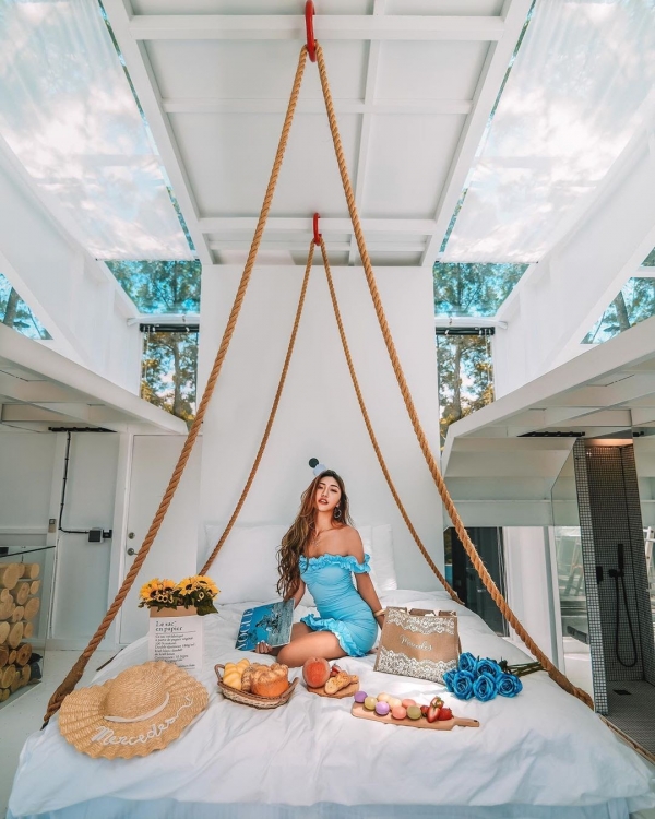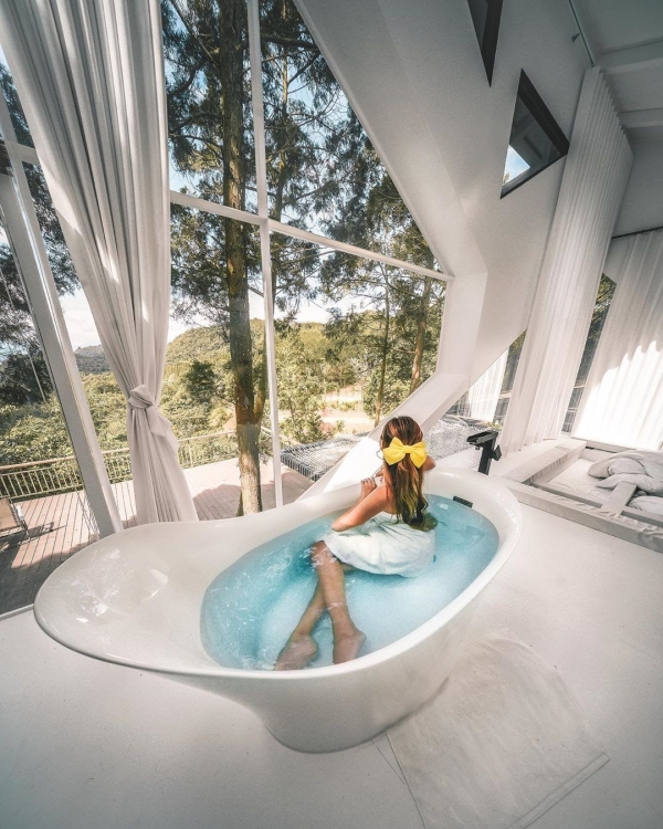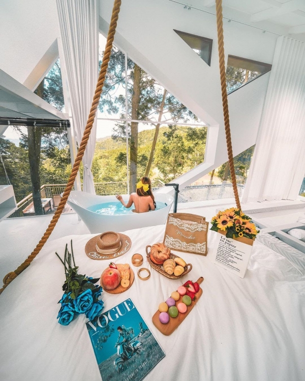 懸掛式的吊床超特別,床旁還有浴缸,大片的落地景窗,可以直望戶外美景,超級享受!