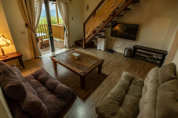挑高的大廳,以水泥為主體建築設計,並添加了許多木頭元素擺設,讓人感到舒適溫馨,戶外也有超大觀景木棧平台,給旅客更貼近原始的生活!