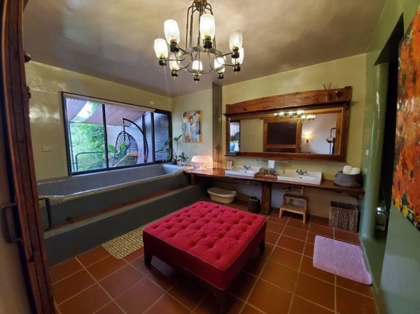 浴室風格也很獨特,重點是還有一個無敵巨大的浴缸,泡上5個人都不是問題,一家五口一起洗澡好像也可以!
