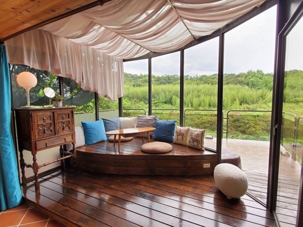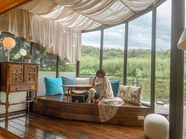 位於主臥室的一處玻璃屋發呆亭,上面用白紗遮擋陽光,圍繞著落地玻璃窗,半月形的木質台階,很適合悠閒的午後和親朋友或伴侶閨密,在這喝茶聊上幾句,愜意的度假,而三芝洋房也是寵物友善住宿喔!可以帶著毛小孩來這跑跳!