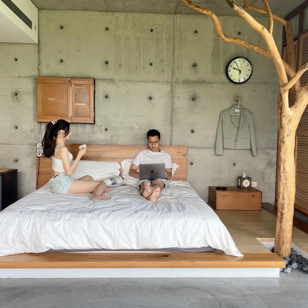 坐落於冬山河旁的獨棟玻璃屋,以清水模工法打造而成,與大自然共生設計,讓陽光直接照亮房間,不僅房內寬敞舒適、有質感,夜晚還能抬頭數星星、眺望河畔美景,絕對是浪漫首選住宿啊!