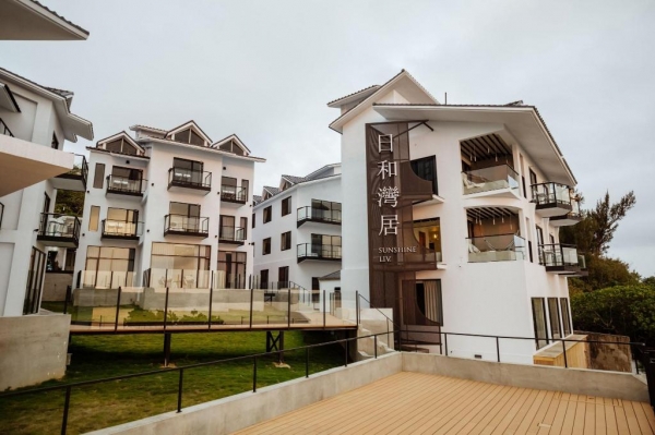 中庭是綠色草皮搭配木頭棧道的簡約設計,室內則結合了北歐風與日系淺色木質調,所有的房間都有設置大面落地窗及全視角獨立陽台,不只住的舒適,還能讓眼睛大飽眼福,看無敵海景看到爽。