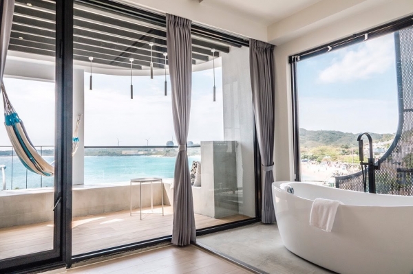 坐擁海景第一排的超讚雙人房型,走進房間就能看到一大片落地景窗,望出去就是南灣的無敵海景,採光非常良好,室內設計以純白與原木色調為主,浴室外漆上寶藍色的油漆,顯眼卻反而更有質感!