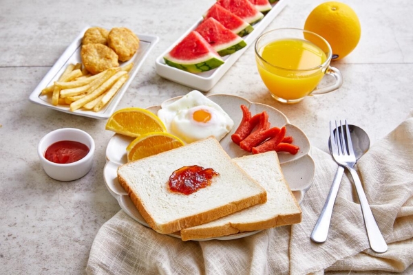 隔天起床最期待的就是民宿的美味早餐啦,吃的健康營養,才能開啟美好的一天,有西式吐司培根蛋,和炸物水果,飽足感充足!