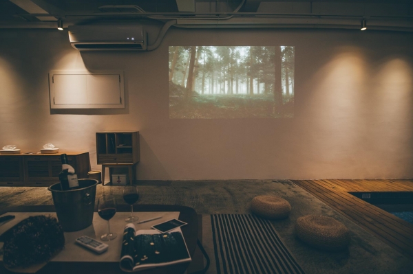 大廳還附有投影幕,夜晚如果想看電影,也可以舒適地躺在沙發上,播放喜歡的電影,配杯紅酒,多麼享受又愜意!
