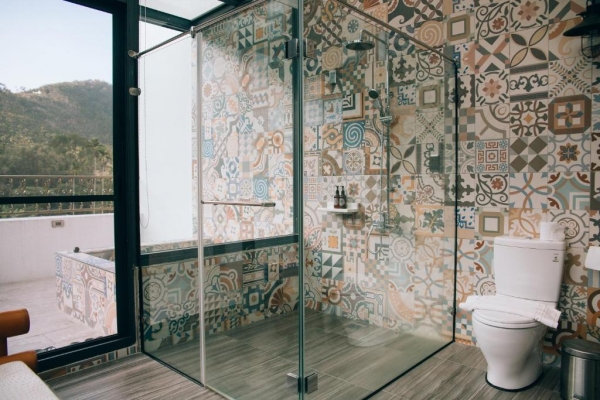 利用幾何圖騰的磚牆打造出來的玻璃屋浴室,好有神秘感又很特別,還能躺在沙發上直望星空,也太浪漫了吧!