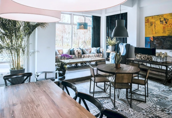 輕工業風的裝潢搭配鄉村配色真的好唯美浪漫啊,讓人走進來都想多拍幾張,大片的落地窗看出去就是落羽松,好像入住森林裡一樣~
