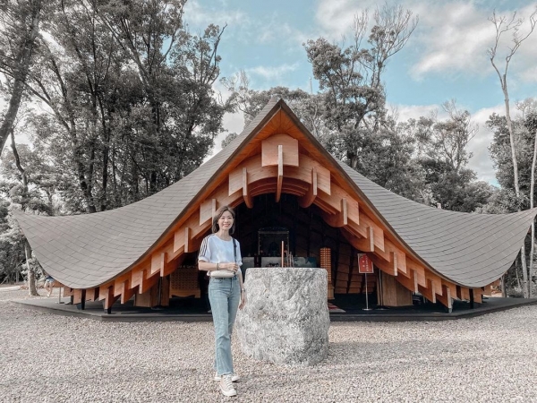 園區內最大亮點就是隱身在山林上的「雲水觀」。這棟「王禪老祖廟」可說是史上最具特色的廟宇,出自日本大師的隈研吾之手。整座建築空間沒有門、沒有牆,不用一顆釘子打造而成,結合了日式和風與東方禪意的意境,而周圍樹林環繞,非常有意竟彷彿走進了另一個世界!
