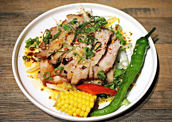 烤到赤赤的松坂豚 真心覺得他們擺盤很用心 連配色都兼顧及到,松阪豬肉俗稱黃金六兩肉 肉質吃起來軟又彈牙 略帶一點微微辣度,搭配玉米 紅椒 糯米椒 洋蔥絲 一起吃 綜合掉不少油膩感。