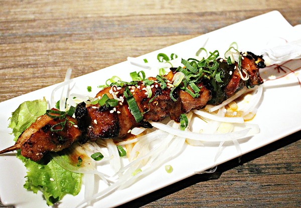 彩椒烤雞肉串 洋蔥絲鋪底 也能搭配著肉串吃 增添些微辛嗆感,雞肉串滿大一串的 皮脆肉嫩 醬烤鹹度剛好 。