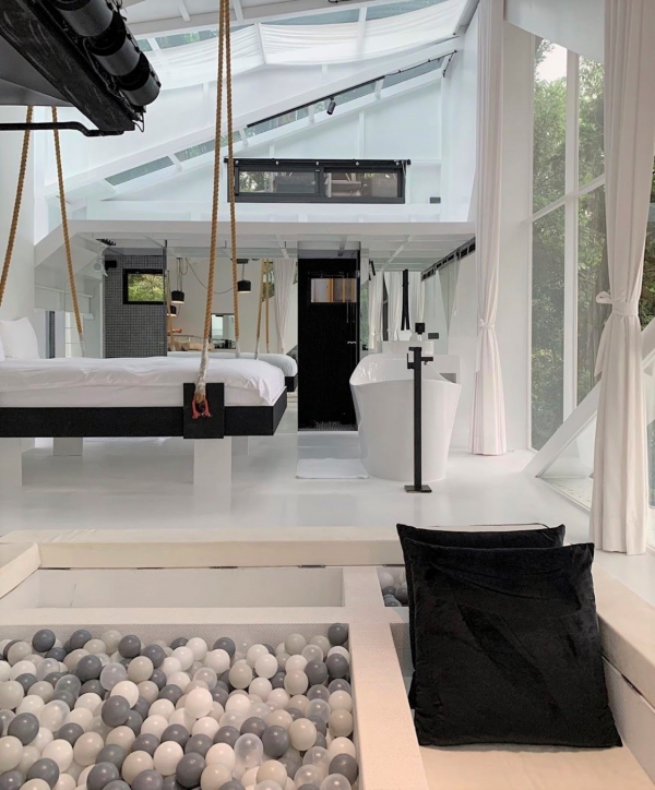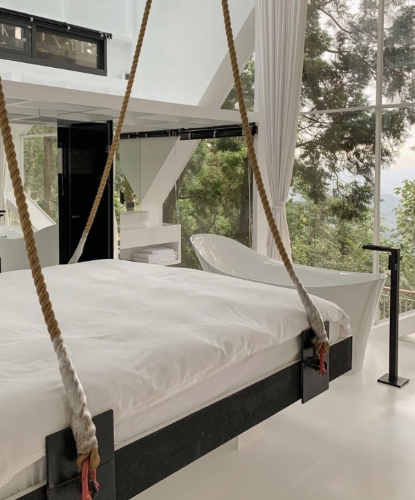 特殊的房型在官網上有特別說明,不開放兒童及中高年入住!及中高年入住!位於山區的環境無法避免蚊蟲,若是比較無法接受的朋友要考慮一下唷,因為民宿都會事先告知!特別的房型把一張雙人床垂吊,透明的大玻璃窗,可以直接欣賞山林美景!舒適寬大的空間真的很放鬆!