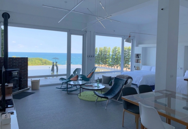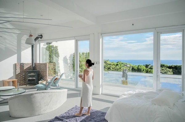 接近20坪、挑高近4米的超大舒適空間,採大片落地窗設計,能將眼前的小丘及海洋盡收眼底,另外還附有燒柴壁爐(欲使用壁爐請加購)、獨立露台,天氣好時超適合坐在戶外放空啦!
