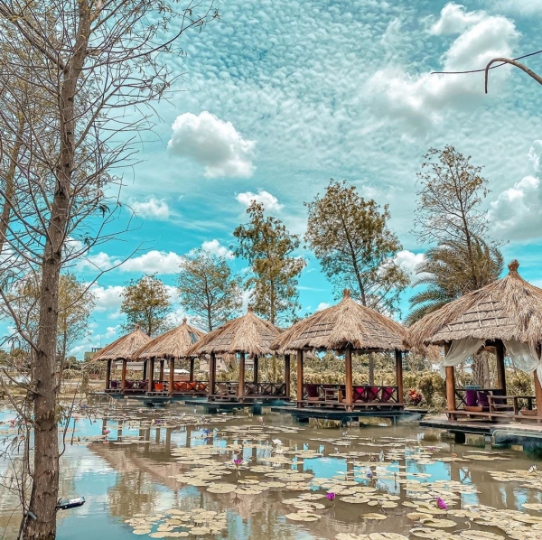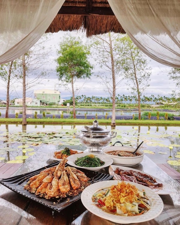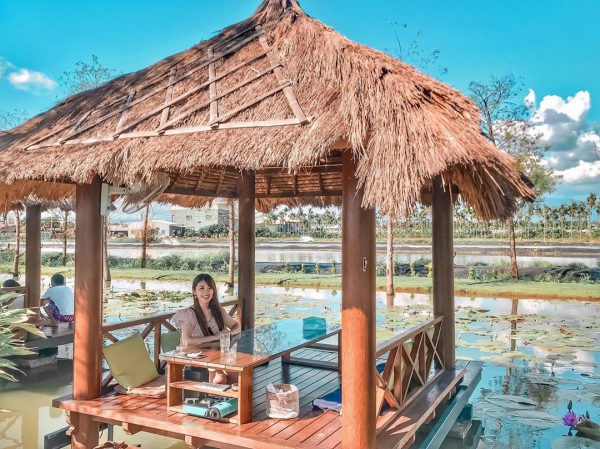 屏東里港鄉的「水明漾活蝦餐廳」是相當知名的一間打卡餐廳,餐廳特別從峇里島運送建材,打造相當道地的一整排發呆亭,氣氛特別悠閒,而一旁超大片的蓮花生態池畔與落羽松,更是讓用餐氛圍更加浪漫!
