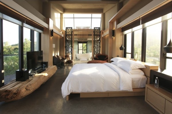 獨棟23坪室內空間,獨享室外300坪花園景緻,開放式客房概念。一棵巨大的樹直接貫穿房內,用玻璃帷幕圍著,意氣風發,整片菱格窗景浴缸,慵懶又享受~