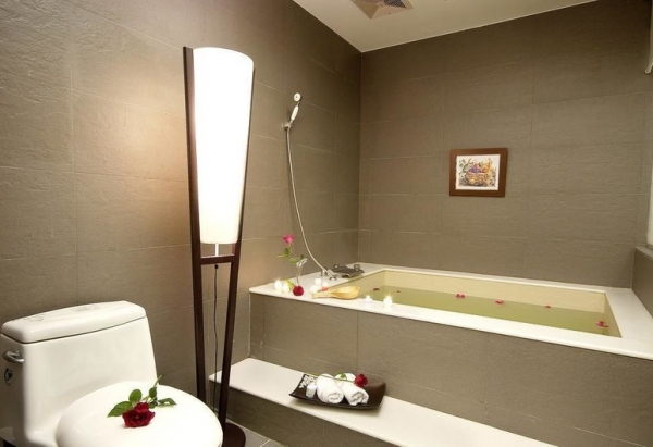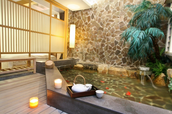 落地窗連結外面半露天專屬泡湯浴池,加上花木的優雅庭園造景,讓人宛如置身在日本溫泉鄉,是家庭、情侶共享親密泡湯樂趣的最佳選擇!