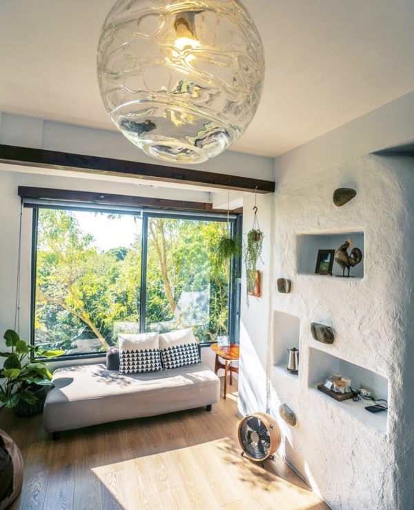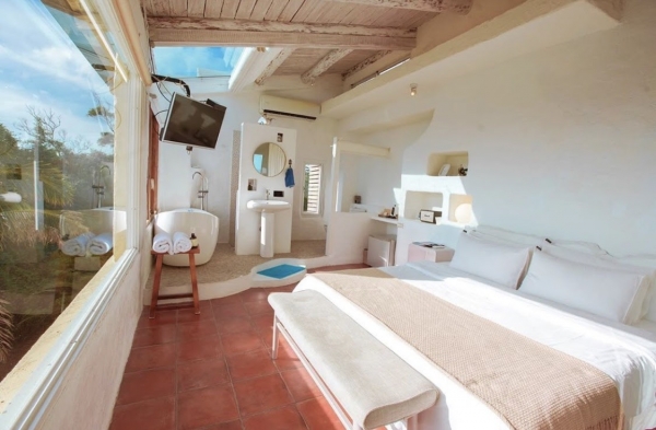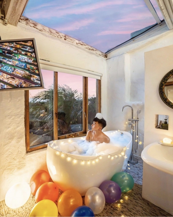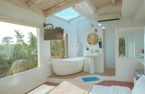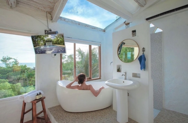 開放式的浴室,讓人有一種與森林共浴的感覺超級放鬆身心!透明的窗在浴缸泡澡還能欣賞湛藍大海,夜晚抬頭透明的天窗仰望星空數星星!很適合情侶小小蜜月極度浪漫!