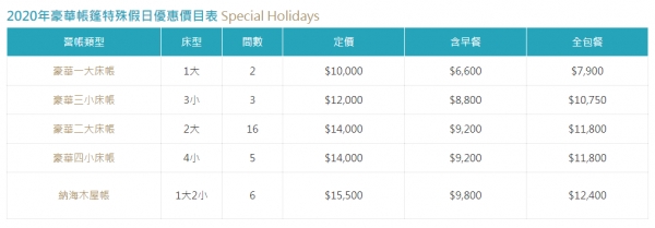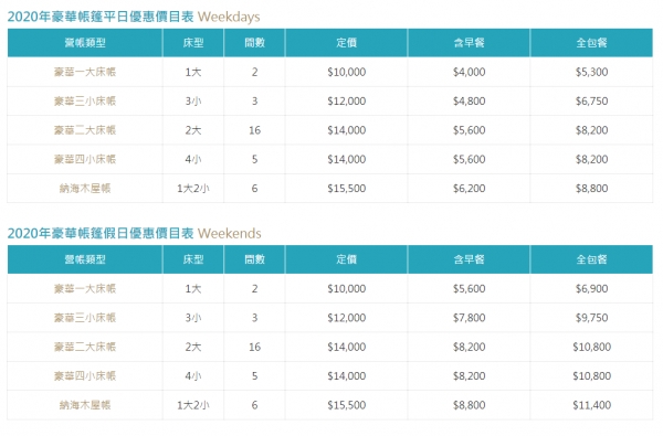 此優惠價格適用到2020/12/31止,直接下殺將近4折,平日住宿還更划算,平均每人最低只要1400元,如果要加全包餐再額外加錢!快趁著假日來這邊享受露營樂趣吧!