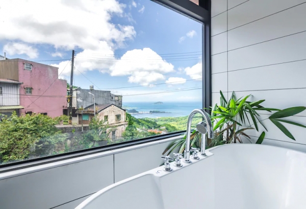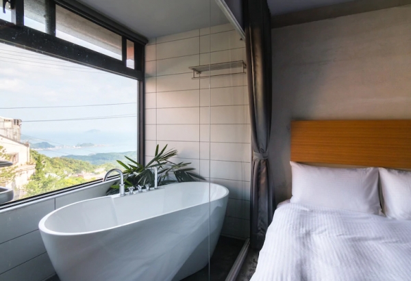 詢問度超高!以海景工業風格打造的民宿,房內充滿著古典的氣息,牆上佈滿了各式山水圖案,讓整間房更有屬於九份的味道!有些房型甚至還附有浴缸,可以一邊泡澡一邊享受無敵美景!