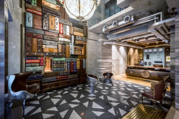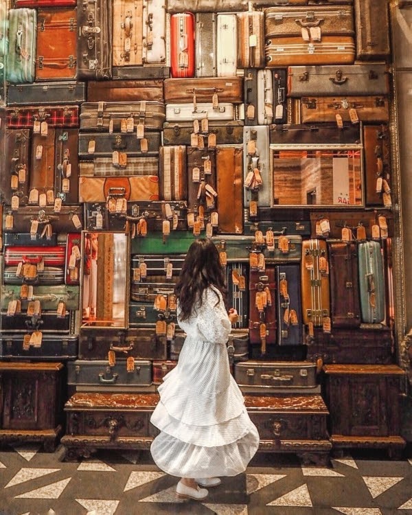 走進大廳,這浮誇又有設計感的裝潢,讓人眼睛為之一亮,一旁的牆面仔細一看,居然是由200個不同的行李箱堆疊而成的「千歲牆」,乘載著無數個未知與期待,其中還有一個是闆娘的嫁妝皮箱呢!