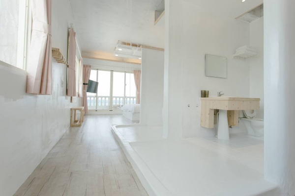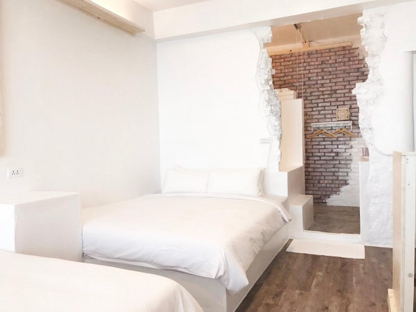 適合家族旅遊的四人房型,簡約純白的設計,還有斑駁設計的紅磚為浴區塊,室內浴缸水池也是超好拍的景點!