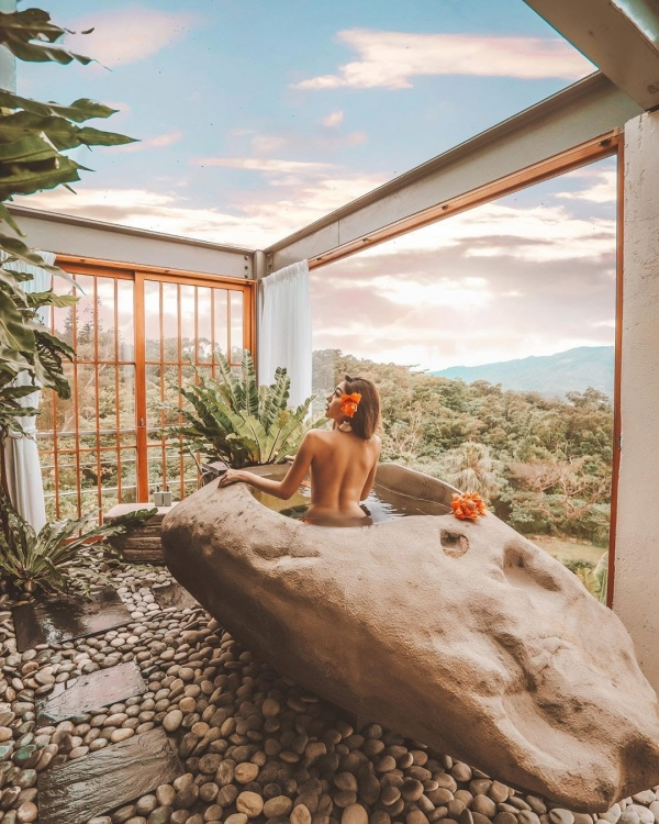 除了擁有上下座無邊際泳池之外,最吸睛的就是270度全景式浴室,裡頭還擺放了巨石打造的能量浴缸,讓你可以一邊泡澡一邊欣賞美景,簡直人生一大享受!