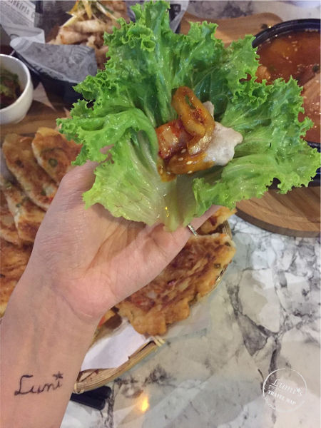 沾著辣醬搭配泡菜包在生菜裡吃更過癮!