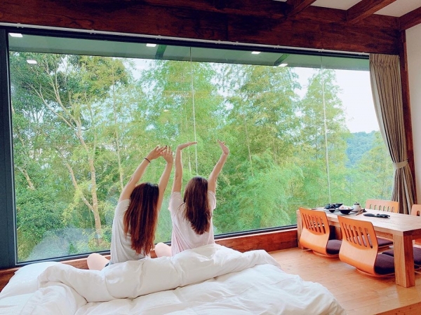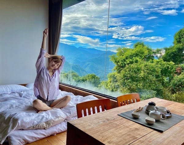 位於阿里山半山腰一間日系秘境旅宿,房內寬敞又舒適,採大片雙景落地窗設計,放眼望去即是整片茶園、雲海美景,其裝潢擺設也超道地,日式榻榻米搭配木質家具,讓人感到愜意放鬆,有種回到家的溫暖,是個遠離喧囂的好所在啊!