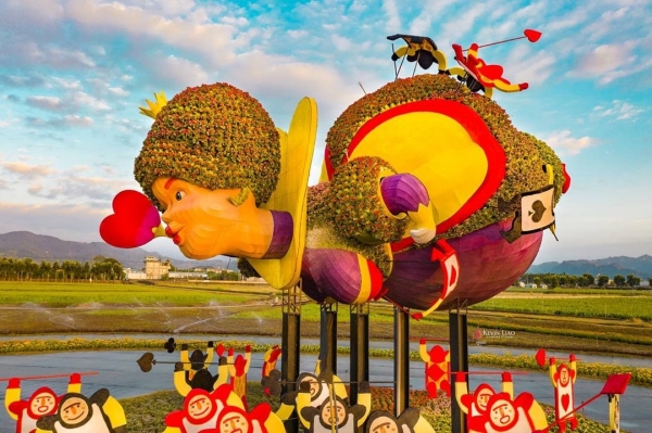 「2020臺中國際花毯節」即將在本週六盛大開幕,以經典知名童話《愛麗絲夢遊仙境》為主題,打造出「愛麗絲的花境探險」特別企劃。一進展場就能看到許多大型植栽藝術,尤其這10米高的紅心皇后最為顯眼!整個園區以塑造成柴郡貓型的迷宮,以此為啟發,讓遊客們沉浸在「夢境」與「迷宮」中,對於不同岔路做選擇,留下深刻啟發!