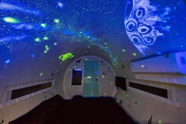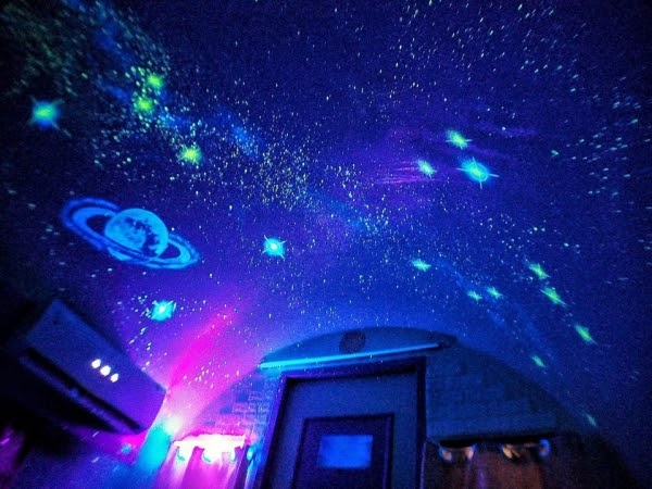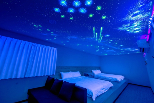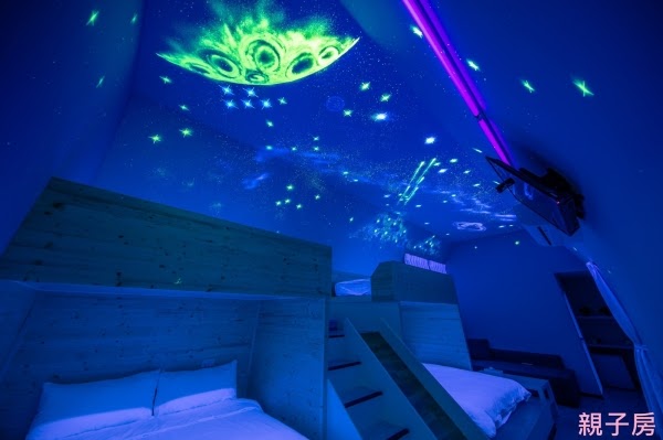 房內還有個超吸睛裝置!如果開啟星空開關,天花板上就會有滿片絕美星空伴你入眠,彷彿闖進了宇宙隧道,讓人超興奮!