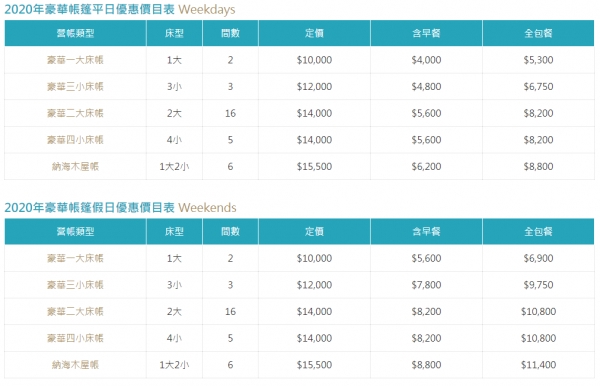 此優惠價格試用到2020/12/31,平日住宿更加划算,最低平均一人只要1400元,如要加全包餐再額外加錢!
