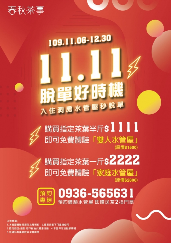 從11/6開始一直到12/30,購買指定茶葉半斤只要1111元,就可以免費入住雙人水管屋!還會再加碼送茶二指故事館免費入場卷2張!想要入住家庭房也沒問題,購買茶葉1斤2222元,就能免費睡一晚!