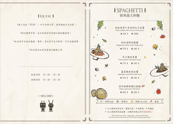 主要販售義大利麵、燉飯、三明治、潛艇堡,還有各式飲品等等。